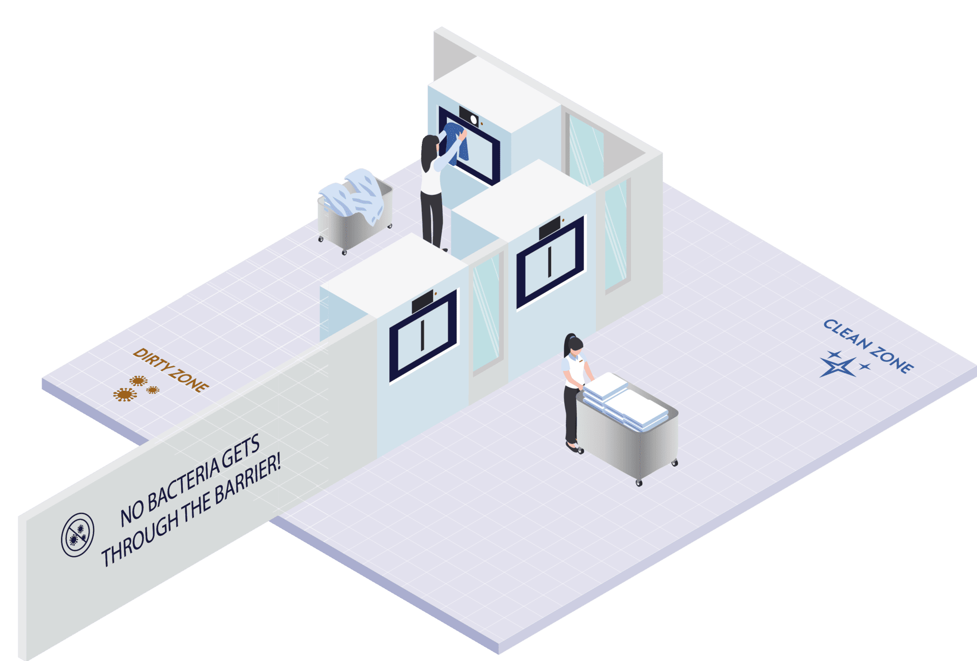 Our cutting-edge barrier technology acts as an impenetrable shield, safeguarding textiles from external contaminants at every stage. From the moment items enter the system to their final cleaning phase, this advanced system guarantees the elimination of germs, offering users round the-clock peace of mind. Whether in healthcare facilities, hospitality settings, or any environment where cleanliness is paramount, our Germ-Free System sets a new standard, providing confidence and assurance in maintaining the highest levels of hygiene.